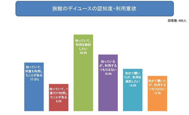 今回の「日帰り旅行」と「デイユース」に関する調査では、新型コロナウイルスの行動制限の緩和前と比べ、36.8%が「現在の日帰り旅行への意欲が増した」と回答しており、「旅館のデイユースを利用したことがある・検討したい」は68%を超える結果となりました。また、65.3%が「日帰り旅行で県民割や都民割を積極的に活用する」と回答していることなどから、今後のデイユース市場の発展に期待を持てる結果となりました。