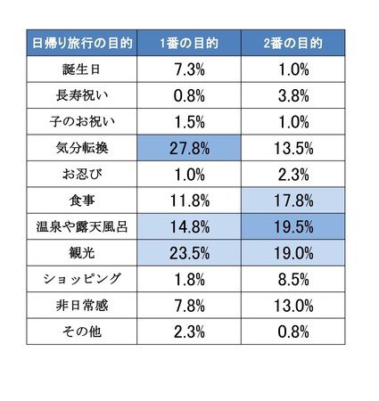 「気分転換」や「観光」に次いで、「温泉や露天風呂」日帰り旅行の目的として高い傾向が見受けられます。