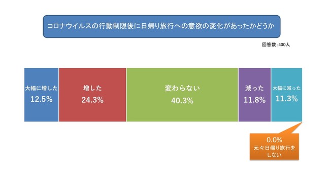 コロナウィルスの行動制限が段階的に緩和されている状況で人々の日帰り旅行への変化は、「増した24.3%」、「大幅に増した12.5%」と36.8%が日帰り旅行への意欲が増している結果となりました。