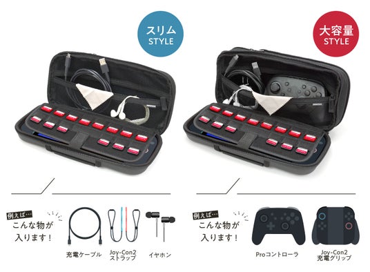 ちょっとしたお出かけに便利なフラットポーチから、片付けに便利なバッグ、変身型のポーチまで幅広くラインナップ。また、ガラスフィルムやゲーム操作に便利なアタッチメントなど盛り沢山。