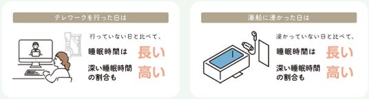 テレワークを行った日の睡眠記録は、行っていない日と比べ睡眠時間が長く、深い睡眠の割合も高いことが判明。テレワークを行った日の睡眠記録は、入浴時に「湯船に浸かった」割合が4.1%高いことに加え、湯船に浸かった場合は浸かっていない場合よりも、睡眠時間は長く、深い睡眠の割合も高いことから、テレワーク実施による移動時間等の削減が、睡眠に好影響を及ぼしていると推察される。