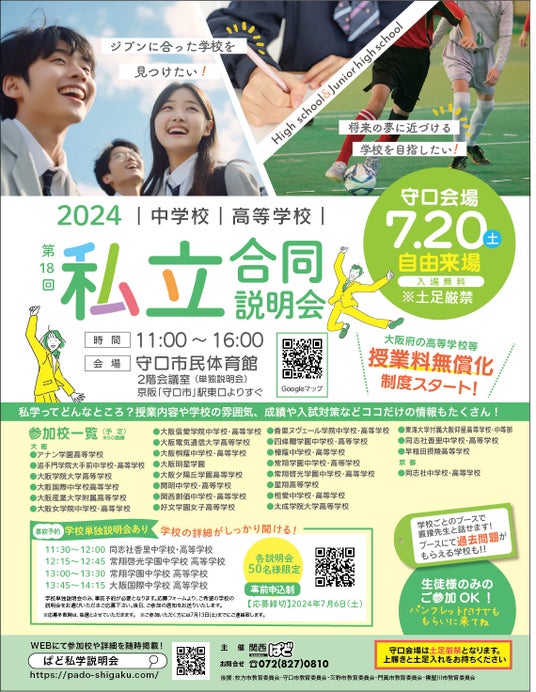 株式会社関西ぱど(本社:大阪市西区靭本町1-10-24 三共本町ビル5F 代表取締役 富岡 紀幸)は、私立の中学校や高等学校への進学を検討されている児童や生徒、保護者の方が、一度に複数の学校から直接情報を得ることができるイベントを開催いたします。