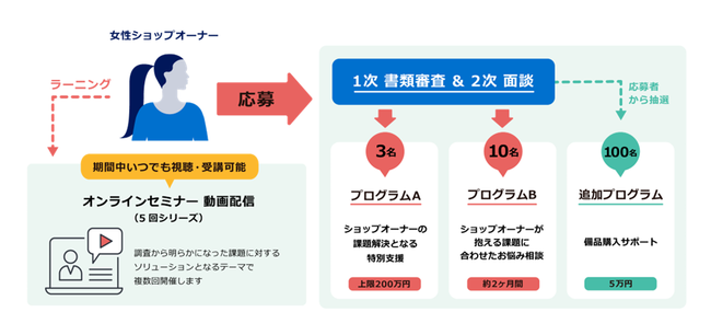 女性のショップオーナーのチャレンジを応援する2つのプログラムの参加者を募集いたします。期間中にご応募いただいた方のなかから、書類選考や面談を通じて、各プログラムの受賞者を決定いたします(両方へのご応募も可能です。ただし、いずれかの受賞となります)