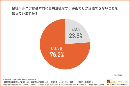 「鼠径ヘルニアは基本的に自然治癒せず、手術でしか治療できないことを知っていますか?」と質問したところ、約8割の方が『いいえ(76.2%)』と回答しました。