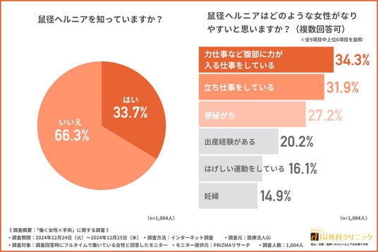 「鼠径ヘルニアを知っていますか?」と質問したところ、『はい(33.7%)』『いいえ(66.3%)』という回答結果になりました。