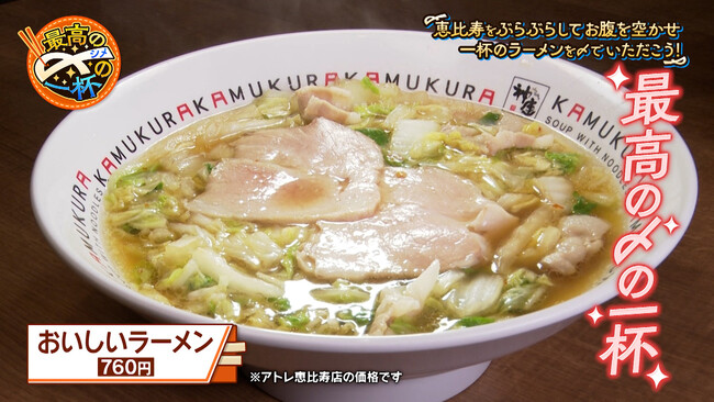 MCにスピードワゴンの井戸田さん、ゲストに村上佳菜子さんをお迎えし、一杯のラーメンを最高の空腹状態で味わうために恵比寿を街歩きします。街ぶらでおなかをすかせる企画のはずが、ルール無視の珍道中に…!? 番組の最後には視聴者プレゼント情報もございます。
