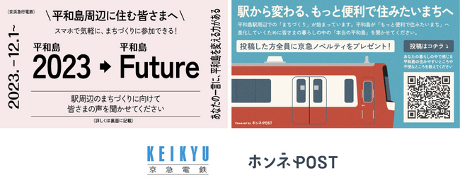 VOC(Voice Of Customer:顧客の声)の収集設計・分析からファンづくりまで一気通貫で支援を行う株式会社はこぶん(本社:東京都中央区、代表取締役:森木田剛)は、京浜急行電鉄株式会社(本社:横浜市西区、社長:川俣幸宏、以下京急電鉄)が取り組む京急線平和島駅周辺のまちづくりにおいて、2023年12月25日(月)よりデジタルレターのコミュニケーションツール「ホンネPOST」の導入・運用を開始し、地域の方の声を聴き,まちづくり施策に生かす仕組みづくりを支援します。