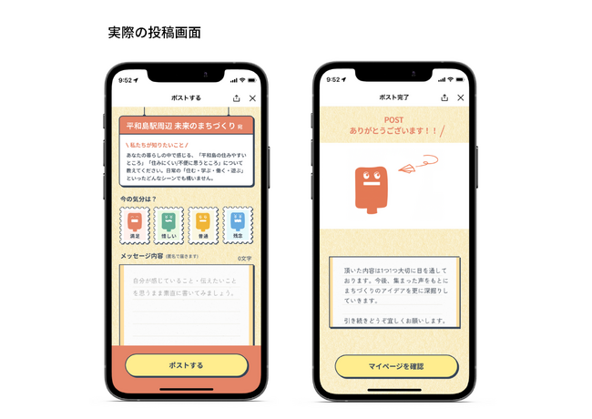 鉄道会社の沿線まちづくり案件におけるホンネPOST導入は初であり,デジタルアンケート手法を活用した新たなまちづくりの施策検討のかたちとなります。若者や子育て世代などを中心に,地域住民の方が日常で感じている「平和島の住みやすいところ・住みにくいところ」といった”平和島のまち”に対する生の声を吸い上げ,まちに必要な機能や課題の把握,今後のまちづくり人材の発掘に繋げていきます。