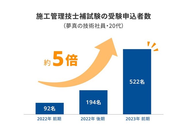 多くの技術社員はキャリアステップとして資格取得を前向きに捉えており、入社から2年以内に資格を取得する社員は増加傾向にあります。また、施工管理技士補を複数の種類で取得する方もいます。2023年前期の受験申込者数は前年比約5倍となり1,000人近くに増えているので、さらなる資格保有者数が見込まれます。