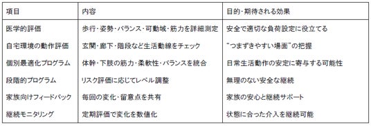 高齢者の転倒予防には、歩行/姿勢/バランスを総合的に評価し、その人の自宅環境に合わせて改善につながるプログラムを設計することが重要です。