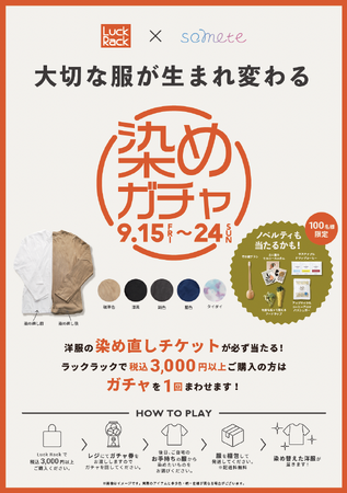 大切な服と全国の染工房を結ぶ“洋服染め直し”アップサイクルプラットフォーム「somete」の運営や地域で服の循環を生み出すアップサイクルコミュニティ「まちのクローゼット」、国内外のアップサイクルブランドが集結した「THE UP CYCLE MARKET」の開催、地域活性事業などを展開する株式会社PlayBlue(CEO:青野祐治、本社:東京都千代田区、以下:PlayBlue)は、株式会社ゲオホールディングス(本社:愛知県名古屋市中区、代表取締役社長執行役員:遠藤結蔵)の子会社である株式会社ゲオクリア(本社:愛知県名古屋市中区、代表取締役:滝城陽介)が運営するオフプライスストア「Luck Ruck」東急プラザ表参道原宿店にて「染めガチャ」キャンペーンを実施いたします。