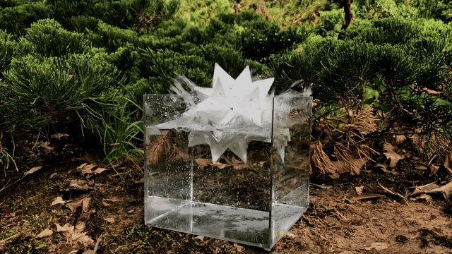 傑作ができたら、作品にスポットライトを当てる時間です。付属のLEDライトを内側に入れて照明を少し落とすと・・・幻想的な光のショーの開演です。