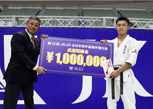 武道奨励金100万円は、一般男子中軽量級優勝の紅谷 凱(極真拳武会さいたま浦和)が獲得!