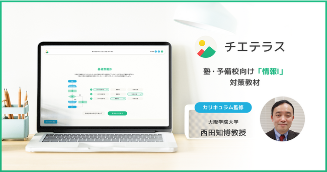 「チエテラス」は塾・予備校向けに情報Iの授業に特化し、2022年から高校で始まった必履修科目に対しての定期試験対策や2025年開始の新課程の大学入試対策が可能なカリキュラムを提供しています。