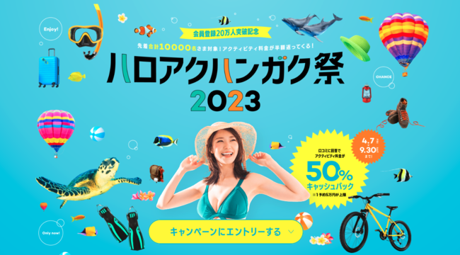 株式会社MEGURU(代表取締役:上原嗣則、本社:東京都千代田区、以下「当社」という)が運営する、旅行者と国内外のアクティビティ主催会社を直接つなぐマッチングプラットフォーム『Hello Activity(ハロアク)』では、2023年4月7日(金)から2023年9月30日(土)の期間、対象者にアクティビティ料金の半額をキャッシュバックする「ハロアクハンガク祭2023」を開催いたします。