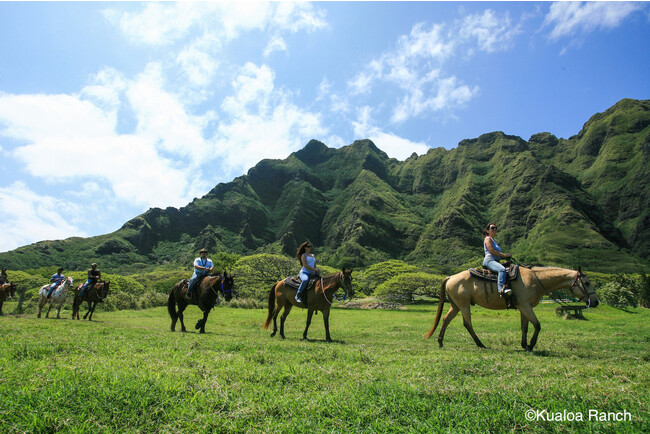ハワイの雄大な自然が残るクアロア・ランチで、大きな空と広大な緑に囲まれて乗馬を体験しましょう。見渡す限りの大草原と大きな山々は、ハワイだから出会える圧巻の光景。まるで恐竜が生きた時代のような、スピリチュアルな雰囲気のなかを乗馬で散策することができます。