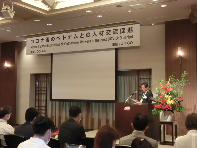 公益財団法人国際人材協力機構(JITCO/ジツコ、所在地:東京都港区、理事長:八木 宏幸)は、2022年9月6日、ベトナム社会主義共和国のグエン・バ・ホアン労働・傷病兵・社会省副大臣をお迎えし「コロナ後のベトナム人材の派遣促進について」のセミナーを開催しました。セミナーは、JITCOとベトナム労働・傷病兵・社会省海外労働局(DOLAB)と共同主催という形式で、ベイサイドホテルアジュール竹芝(東京都港区)において実施されました。