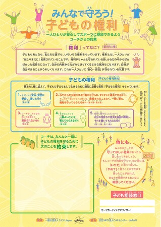 この度、S.C.P. Japanはセーフガーディングの取り組みの一環として、スポーツ現場で子どもの権利を守るために「みんなで守ろう!子どもの権利 ~一人ひとりが安心してスポーツに参加できるようコーチからの約束~」と題したリーフレットを、認定NPO法人 CAPセンター・JAPAN様にご協力いただき作成しました。