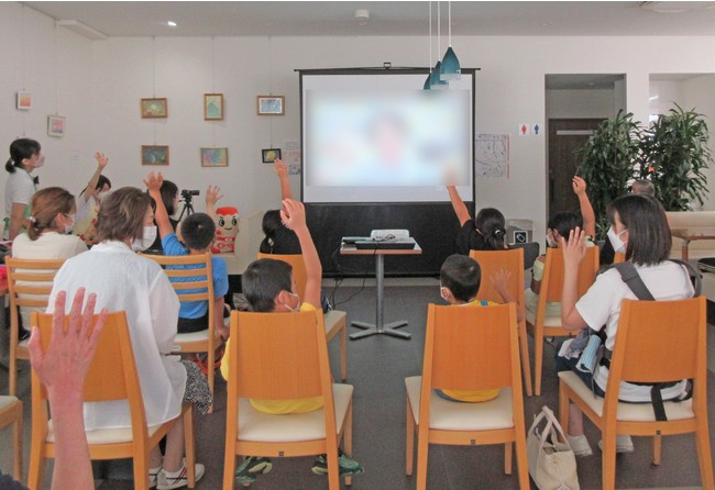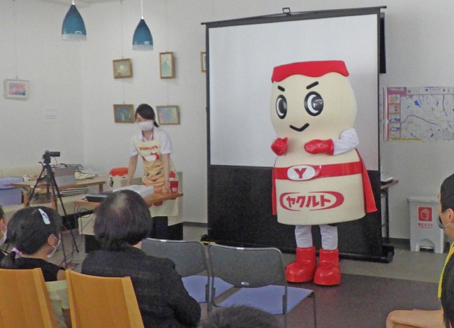 30名を超える参加者があり、とても好評で嬉しく思っています。笑いあり、頷きあり、納得顔あり…いろいろな表情を見せている子どもたち。大人たちは「なるほど」「そうか」と小さな表情で楽しんでいました。神戸市から数回も「ふれあいマート」に来ていただき、打ち合わせをしての開催でした。その熱意が十分に会場に伝わったことと思います。エプロンシアターは熱演で、身を乗り出して見ている子どもがいました。オンライン工場見学は初めてのことであり、とても興味深く、参加者は見ていたと思います。ヤクルトマンの登場にはびっくり!大変お世話になり、ありがとうございました。(小野市公設コンビニ「ふれあいマート」会長 石井 喜晴 様)