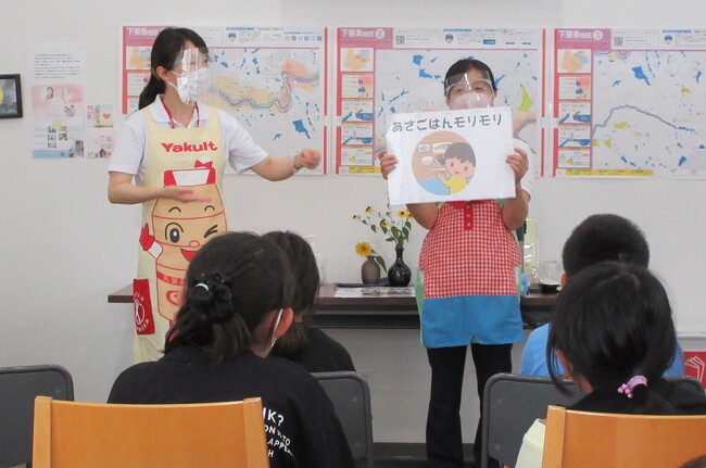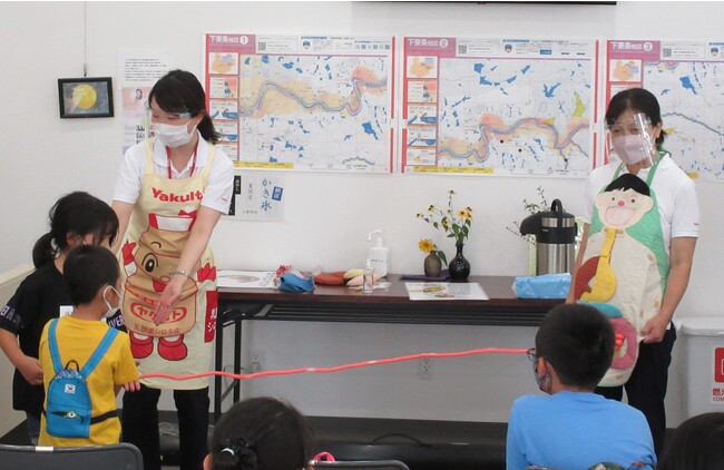 「おなか元気教室」ではヤクルトならではのおなかの健康づくりをテーマに、おなかの仕組みや排便習慣、規則正しい生活習慣の大切さをお伝えしています。お子さまにも楽しく学んでいただけるように、今回は食育のエプロンを使ってエプロンシアターを実施しました。「オンライン工場見学」では、現在コロナ禍でヤクルト工場見学に直接お越しいただくことができない為、オンラインを活用してヤクルト工場のご案内をさせていただいています。馴染みのあるヤクルトがどのようにして作られるのか、普段の工場見学では見ることができない特別な内容をご覧いただきました。今回は夏休み特別企画として、「おなか元気教室」と「オンライン工場見学」を一緒に実施しました。