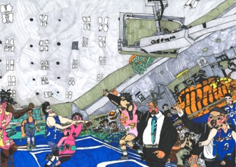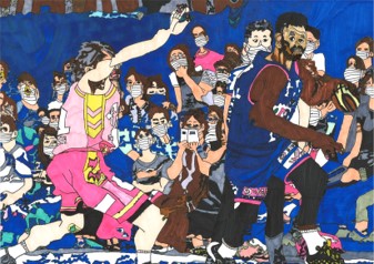 ・第9節 琉球戦にて、生活介護事業所「アトリエ・ブルート」※2のみなさん(3名)による、FE名古屋の選手やヘッドコーチを題材とした作品を展示