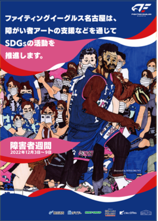 12/3(土)~9(金)「障害者週間」※1に合わせて、 障がいのある人とない人がお互いに尊重し支え合う共生社会の実現を目指し、FE名古屋のホームゲーム会場で「障がい者アート」の 支援などを通じ、意識啓発に係る取り組みを実施することとなりました。
