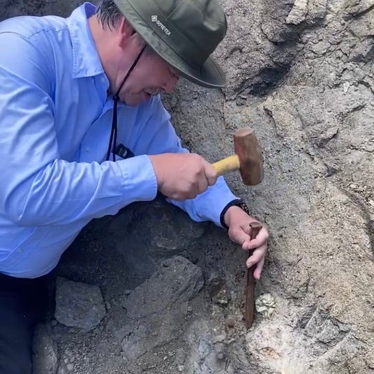 今回のフィールドで太古のクジラの化石を発掘中の平山先生