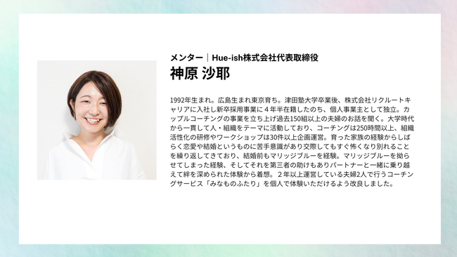 メンターは、これまで150組以上の夫婦との対話経験があり、自身もマリッジブルーを経験したことのあるHue-ish株式会社代表の神原が務めます。