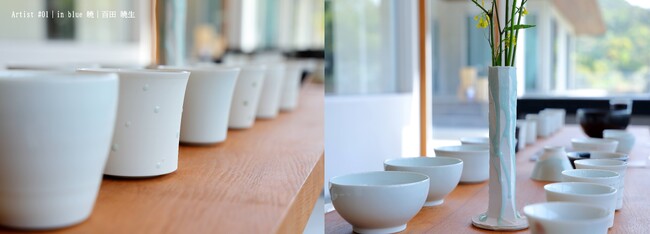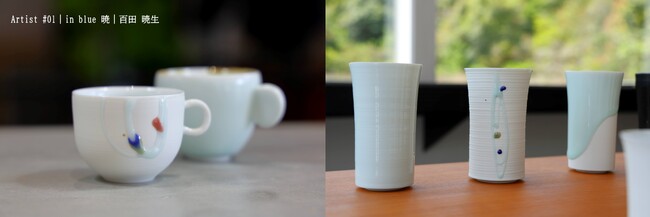 海外からのお客様も多く、また、家庭画報にも取り上げられた人気作家の百田暁生さん(in blue 暁)。端正なフォルムの白磁に、とろりとかかる淡い青や真っ白い素地に釉薬で描く抽象的なデザインが魅力です。作品はどれも品があり凛とした佇まいをしていますが、不思議と柔らかさ、そして温かみを感じさせてくれます。殆どの作品が轆轤(ろくろ)で製作した拘りの一点物です。