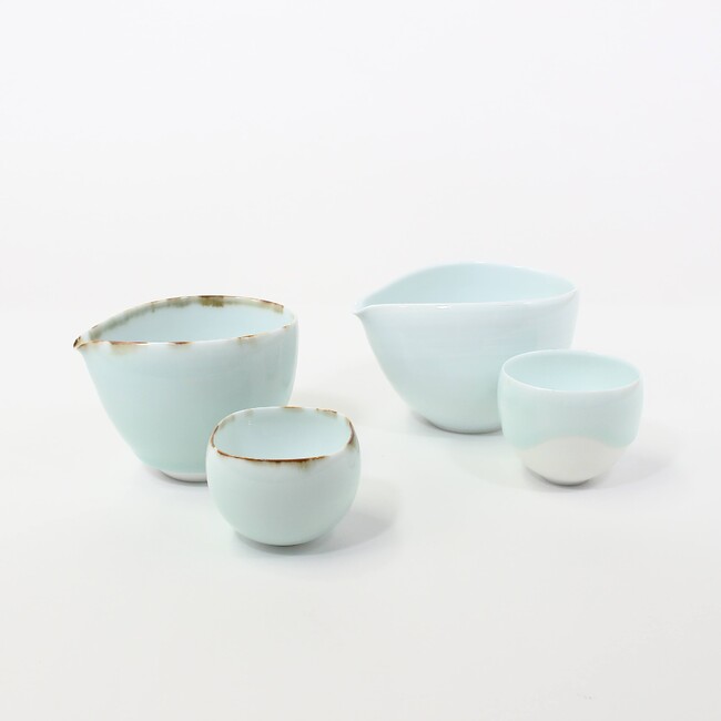 淡い青の釉が美しい青白磁。しっとりとした肌触りが心地よく丸みをおびた優しいフォルムが魅力です。片口は女性にも持ちやすいサイズで適度な手重みと安定感があり、1合弱程度のお酒が入ります。注ぎ口のキレも申し分ありません。是非、片口とセットで楽しんで下さい。