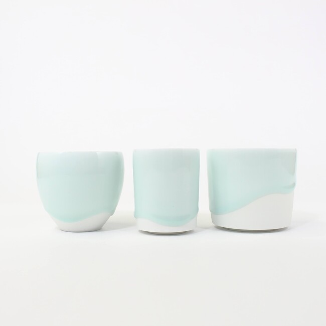 百田さんならではの、とろりとかかる淡い青の釉が魅力。品のある佇まいですが、腰にかけての釉溜まりが何とも言えない景色をつくりだし、不思議と柔らかさと温かみを感じさせてくれます。卓越した轆轤技術により薄く引かれた口縁は口当あたり滑らかです。お茶やコーヒーは勿論、オンザロックでお酒など幅広くお使い頂けます。