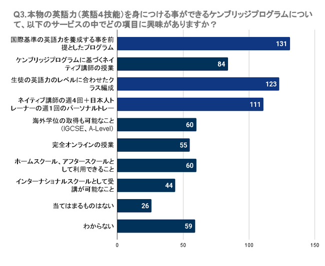 Q3で「本物の英語力(英語4技能)を身につける事ができるケンブリッジプログラムについて、以下のサービスの中でどの項目に興味がありますか?(複数回答可)」と質問したところ、最も多かったのは「国際基準の英語力を養成する事を前提としたプログラム」で131名でした。次いで、「生徒の英語力のレベルに合わせたクラス編成」には123名、「ネイティブ講師の週4回+日本人トレーナーの週1回のパーソナルトレーニング」には111名が興味を持っています。一方で、「インターナショナルスクールとして受講が可能なこと」や「完全オンラインの授業」に関心を持つ人はやや少なめで、それぞれ44名、55名の回答でした。これらの結果から、多くの人は実用的な英語力の養成や個別のニーズに応じた指導に重きを置いていることが伺えます。