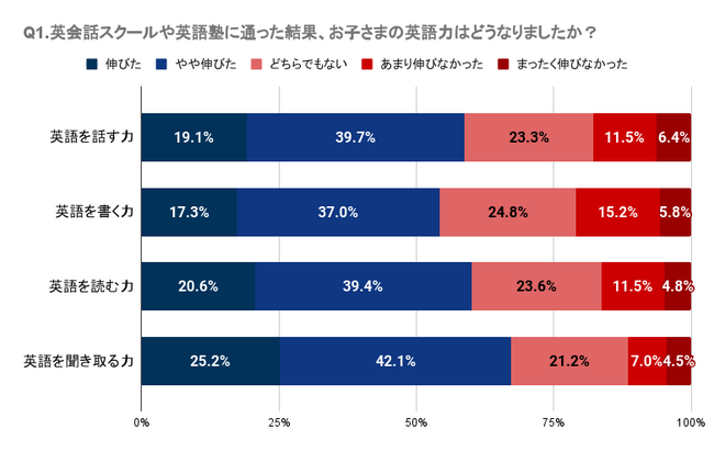 Q1で「英会話スクール、英語塾に通った結果、お子さまの英語力はどうなりましたか?」と質問したところ、英会話スクールや塾に通って英語のスキル向上を明確に感じられなかったと感じている人が一定数いることが分かりました。具体的には、英語を話す、書く、読む、聞き取る各スキルにおいて、「伸びた」と感じる人は20%前後であり、一方で「あまり伸びなかった」や「まったく伸びなかった」と回答した人が合わせて約15%~20%となっています。特に、英語を書く力においては「あまり伸びなかった」と「まったく伸びなかった」の合計が20%を超えています。また、各スキルに関して「どちらでもない」と答えた人も含めると、約30~40%となっており、明確な効果を実感していない人が一定数存在することが伺えます。
