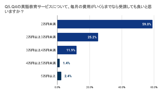 Q4で「受講したい」「料金が安ければ受講したい」「興味がある」と回答した人に、Q5で、「Q4の英語教育サービスについて、毎月の費用がいくらまでなら受講しても良いと思いますか?」と質問したところ、最も多い59.0%の回答者は2万円未満が適切と感じています。25.2%は2万円以上3万円未満、11.9%は3万円以上4万円未満と答えました。対照的に、4万円以上の費用を考える回答者は極少数で、4万円以上5万円未満が1.4%、5万円以上が2.4%でした。これにより、多くの人々が3万円未満の価格帯を望んでいることが明らかとなりました。