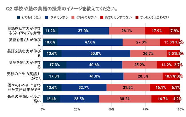 Q1・Q2では、子どもが英会話スクールや英語塾に通っていたが英語力アップの効果を感じていない人が一定数いること、学校や塾の英語の授業に対して明確な効果や良い印象を持てていない人が多いことが明らかになりました。