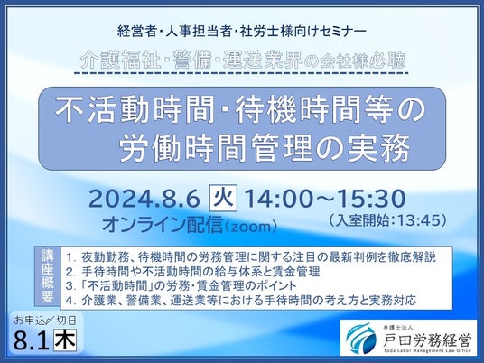 労務問題に特化した弁護士法人戸田労務経営(所在地:千葉県船橋市)では、「不活動時間・待機時間等」を題材とした無料オンラインセミナーを2024年8月6日(火)に開催いたします。