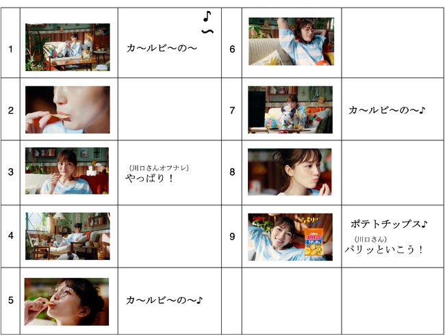 今回の新CMでは、ポテトチップスのパリッとした食感とその後、口に広がる期待通りのおいしさを表現しています。そのため、幅広い世代から知名度・好感度が共に高く、今回のメッセージをインパクトを持って伝えられる川口春奈さんを起用しました。これまでのカルビーCMでも、川口さんはお客様から大変好評をいただいております。映画やドラマなどでも幅広く活躍され、演技力の高さに定評のある川口さんに、おいしそうに食べていただくことで、ポテトチップスが、お客様に「食べたい!」と思っていただける商品になることを期待しています。