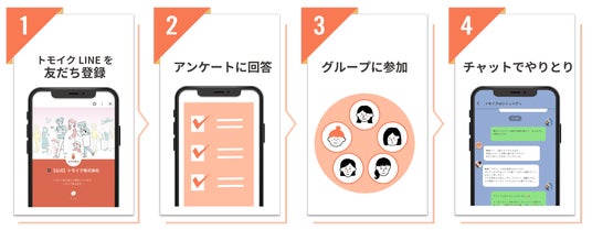 トモイク独自アンケートにご回答いただき、育児価値観の似ているママ5人とマッチング。AI保育士1人を含めた6人のコミュニティをつくります。 コミュニティでは、情報交換・お悩み相談・雑談など他のママと自由にコミュニケーションをとることができます。