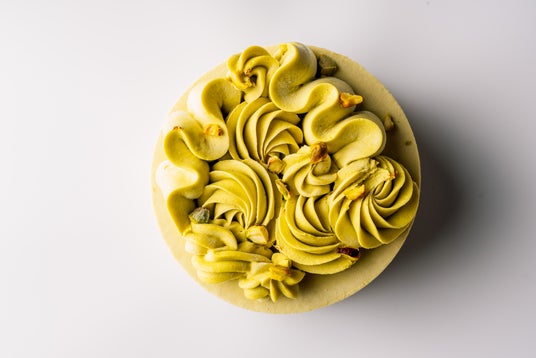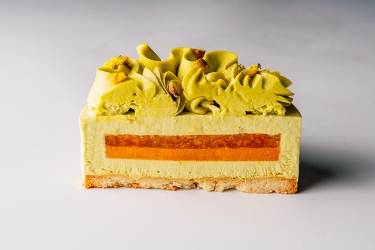 構成:下から、クッキー生地、ピスタチオムース、パッションフルーツのクリーム、アプリコットのジュレ、ピスタチオの濃厚クリーム、飾りにローストピスタチオ