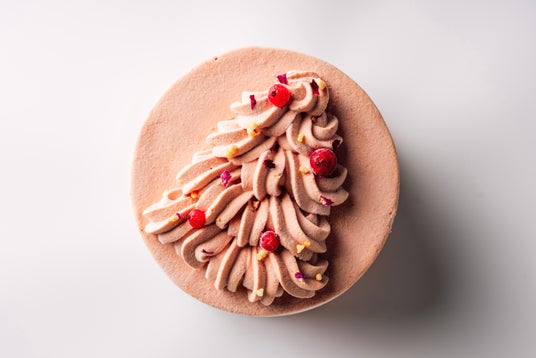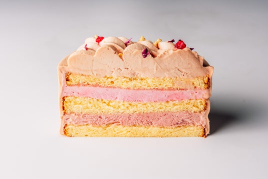 構成:下から、国産小麦のスポンジ、いちごとチェリーのムース、赤すぐりとライチのムース、ラズベリーのバタークリーム、飾りに赤すぐりとアーモンドとエディブルフラワー