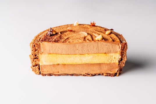 構成:下から、有機ココアのクッキー、有機チョコレートガナッシュ、塩キャラメルソース、キャラメルムース、有機チョコレートムース、有機ココアのスポンジ、飾りに有機チョコレートとヘーゼルナッツとチョコレートホイップ