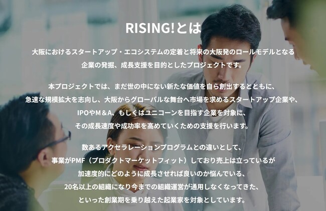 「RISING!」は、大阪にスタートアップ企業が持続的に生まれ成長するためのエコシステムの定着と、大阪発のロールモデルとなる企業の発掘・成長支援を目的としたプロジェクト。年商1億円以上、創業10年程度で大阪に拠点を持つ企業が参加できます。