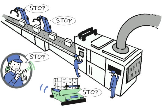 人と機械が連携・共働する場所では、機械の動作そのもの、あるいは機械の故障により、人の安全が脅かされるリスクが存在しますが、本製品を用いることで、意図しない挙動を示した機械に対し、遠隔から非常停止の指示をすることが可能となります。