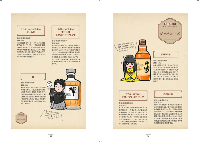 お酒の魅力というのは言葉で説明するとなかなか取っ付きづらいもの。そこで本書では、著者自身がウイスキーに感じた印象をキャクター化して紹介しています。数多あるウイスキーから、自分好みの1本を見つける参考にしてみてください。もちろん本書ではその他ウイスキーに関する基礎知識もわかりやすく解説。ウイスキーにまつわる歴史の物語もマンガ仕立てで掲載しています。