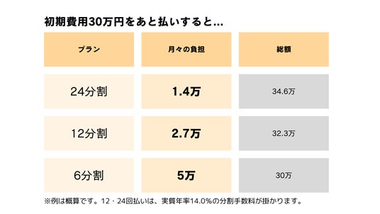 賃貸物件の契約時にかかる敷金・礼金・前家賃などの初期費用を最大24回までの分割払いが可能です。XROOMS Pro(エックスルームスプロ)」を通じて賃貸物件をご成約されたお客様は、敷金礼金といった初期にかかる費用のお支払い方法として、通常の一括払いのほか、分割手数料なしの「6回払い」から「12回払い・24回払い」をご自身のライフスタイルに合わせて自由にお選びいただけます。