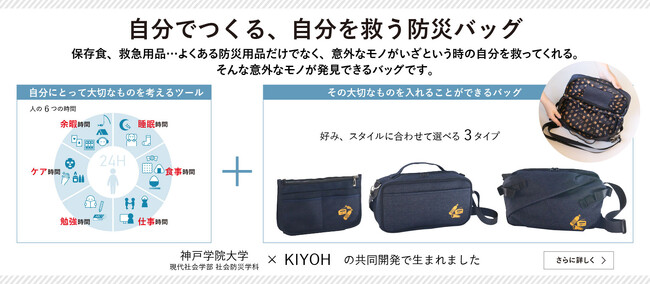 神戸学院大学 現代社会学部 社会防災学科の学生と株式会社 基陽(安全保護具メーカーKIYOH CO.,LTD 代表取締役 藤田尊子)共同開発の防災バッグです。