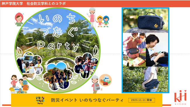 神戸学院大学 現代社会学部 社会防災学科の学生と安全保護具メーカーが一緒に考えた「自分でつくる、自分を救う防災バックシリーズ」は2022年より開催されている防災イベント「いのちをつなぐパーティ」より発案しました。イベントは2023年は11月11日(土)に神戸学院大 社会防災学部と基陽の共催(第二回)、地域住民と共に防災意識を高めるワークショップ、防災食育関連のイベント等も開催されています。