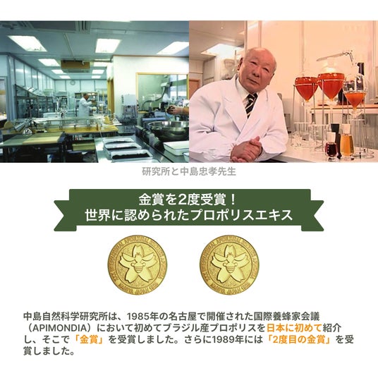 銀座・柳韓堂が展示・販売している「グリーンプロポリス」は、同じプロポリスでも本物中の本物といえる最高峰のプロポリスである。それというのも、日本で初めてブラジル産プロポリスを紹介し、プロポリスのパイオニアとして名高い、中島忠孝博士が研究開発した中島プロポリスと呼ばれる製品を基調としたものだからである。中島プロポリスは、国際養蜂会議(APIMONDIA)において、名誉ある金賞を2回も受賞している。中島忠孝博士が亡くなられた後、その天然原料と精製原液の処方(植物由来のアルコールで丁寧に抽出)を正当に引き継ぎ、「30年の熟成期間」を費やし、「ブラジル産の天然原料」、「添加物完全フリー」で蘇らせ、完成させたのが、銀座・柳韓堂の「グリーンプロポリス」である。
