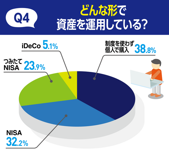 資産運用の方法については「制度を使わず個人で購入」が38.8%で、最も多い結果になりました。このなかには、NISAやつみたてNISAでは扱っていない金融商品(外貨や暗号資産など)で資産運用している人たちも含まれます。