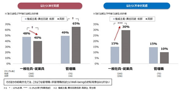 日本企業の組織文化がはたらく幸せ実感を下げていることが判明 特に、非管理職のはたらく幸せ実感が低く、不幸せ実感を上げる要因に